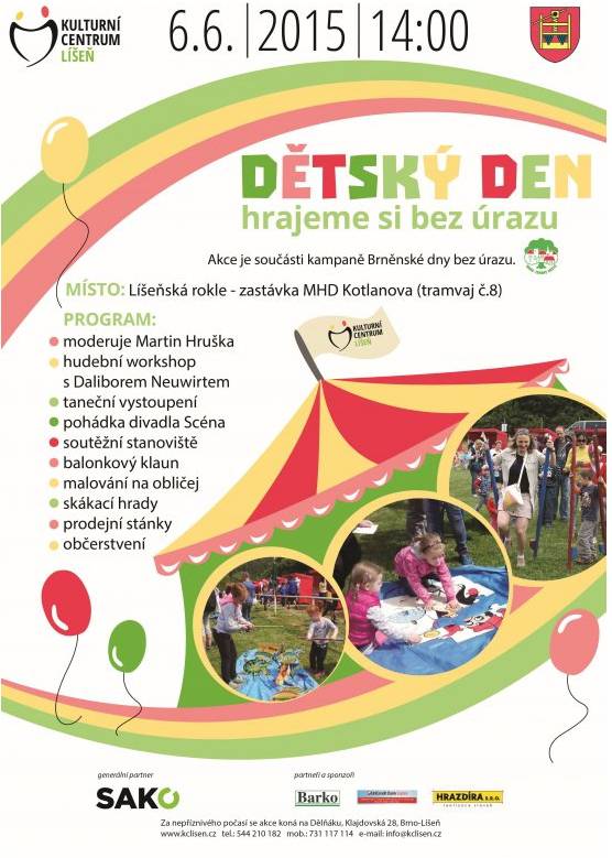 Dovolujeme si Vás touto cestou pozvat na již tradiční Dětský den pořádaný Kulturním centrem Líšeň. Letošní ročník je součástí kampaně Magistrátu města Brna a kanceláře Brno – zdravé město Brněnské dny bez úrazů. Touto akcí se naše organizace zapojuje do celoměstského projektu, zaměřeného na prevenci úrazů.
