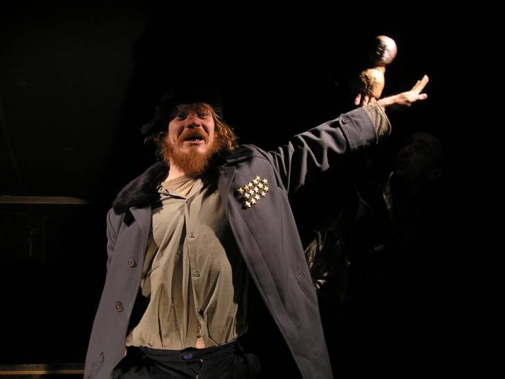 Inscenace se hraje ve vojenském stanu, nejvýraznějším jevištním prvkem je velký psací stůl, sloužící jako dějiště pro „výjevy z Ruska”.