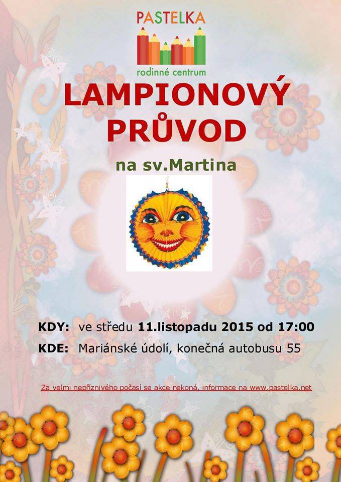 Lampionový průvod na sv. Martina s RC Pastelkou v Mariánském údolí od 17:00hod. Za velmi nepříznivého počasí se akce nakoná. Více informací na www.pastelka.net.