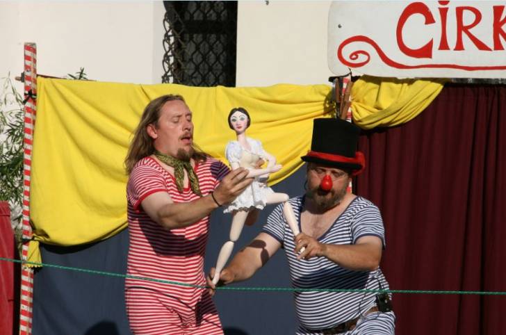 Představení v sobě spojuje prvky pouličního divadla a loutkové scény.