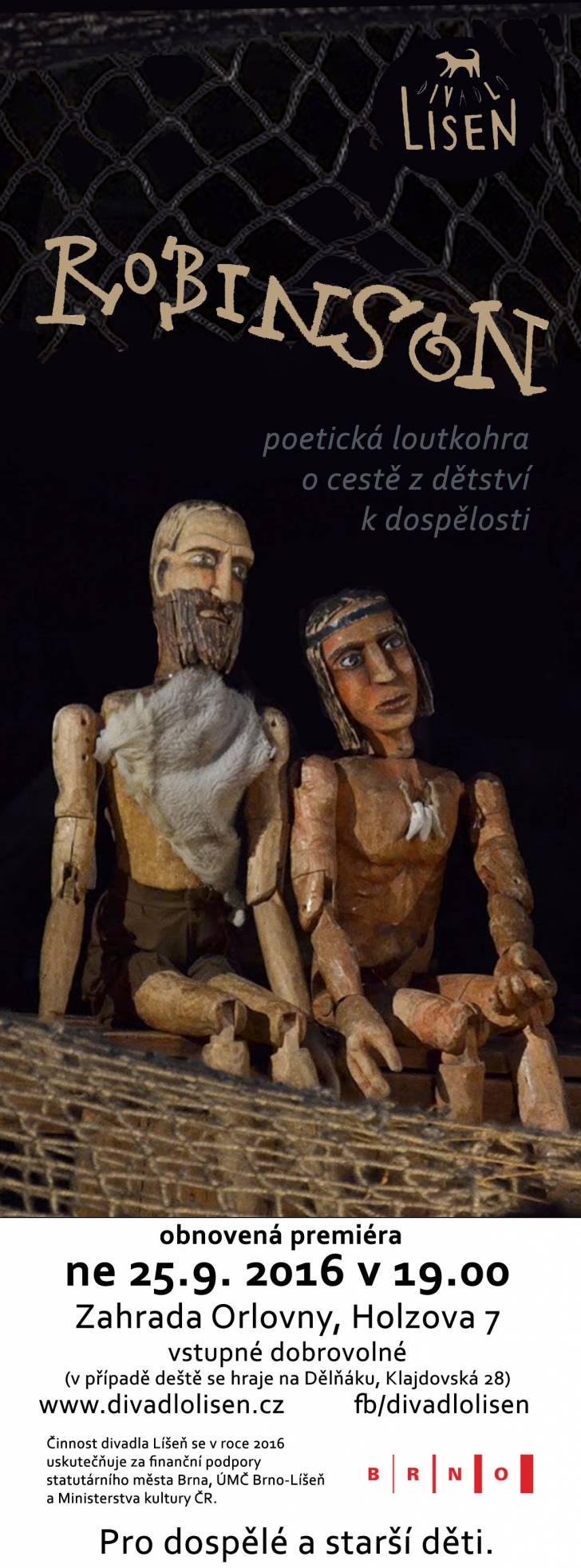 Volná adaptace románu Daniela Defoea. Poetická inscenace se soustředí na vnitřní život hlavní postavy. Je to hra o rozporu snu a skutečnosti, o cestě z vysněného světa do reality, o bolestné proměně dítěte v dospělého, v němž zůstává dětství jako nekonkrétní silná touha.