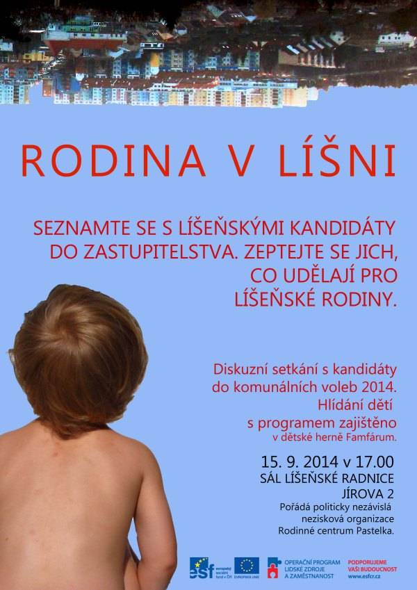 Diskuzní setkání s kandidáty do komunálních voleb 2014. Zeptejte se jich, co udělají pro líšeňské rodiny. Hlídání dětí s programem zajištěno.