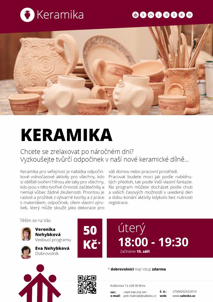 Keramika pro veřejnost je nabídka odpočinkové volnočasové aktivity pro všechny, kdo si oblíbili tvoření hlínou ale taky pro všechny, kdo jsou v této tvořivé činnosti začátečníky a nemají vůbec žádné zkušenosti. Prioritou je radost a prožitek z výtvarné tvorby a z práce s materiálem, odpočinek, cílem vlastní výrobek, který může sloužit jako dekorace pro váš domov nebo pracovní prostředí.