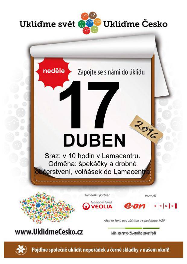* Sraz brigádníků a rozdej pracovních rukavic a pytlů: v 10 hodin v Lamacentru