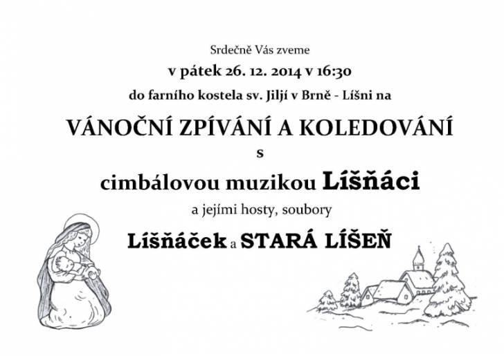 Srdečně Vás zveme do farního kostela sv. Jiljí na VÁNOČNÍ ZPÍVÁNÍ A KOLEDOVÁNÍ s cimbálovou muzikou LÍŠŃÁCI a jejími hosty, soubory Líšňáček a STARÁ LÍŠEŇ.