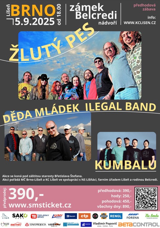 • od pátku do neděle zvýhodněné vstupné 890 Kč – včetně Líšeňských hodů, Děda Mládek Ilegal Band, Žlutý Pes, Kumbalu a Kateřiny Marie Tiché